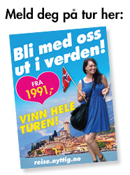 Sjekk ut alle våre spennende turer. Nå trekker vi vinner hver uke. Blir du en av de mange heldige som vinner HELE TUREN - reise - opphold - utflukter - mat? Mer info på reise.nyttig.no Gjennom 15 år har våre dyktige norske guider vist tusenvis av gjester spennende steder rundt omkring i verden. Nå kan du også få glede av godt tilrettelagte turer og sikre deg fine reiseminner for livet. |
